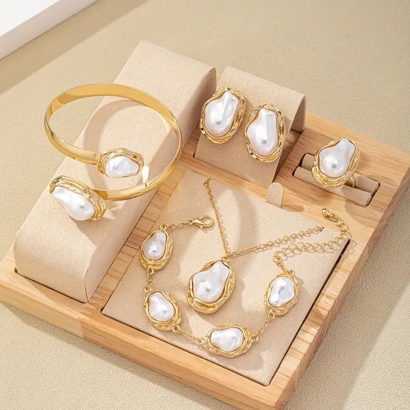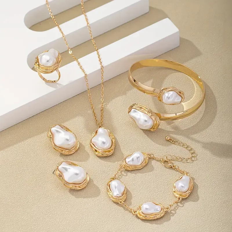 🎁New Year's Sale🎁Fashion European and American Style Jewelry Set Irregular Imitation Pearl Necklace Earrings Bracelet Ring Bracelet Combination Jewelry Set Women's Romantic Jewelry Gift