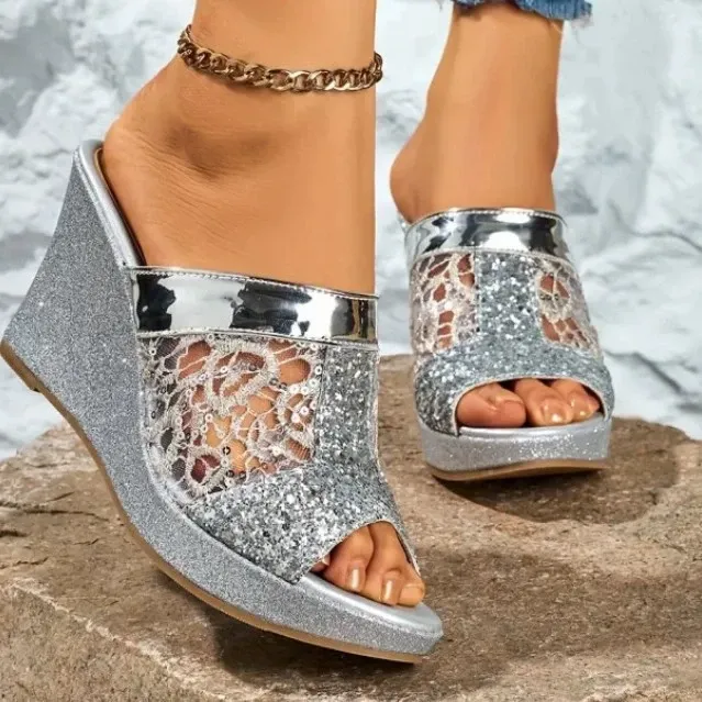 🔥2025 HOT SALE -50%🔥Premium Summer New Arrival Solid-Colour Women's Sandals with Sequins and Lace High-Heel Strappy Sandals