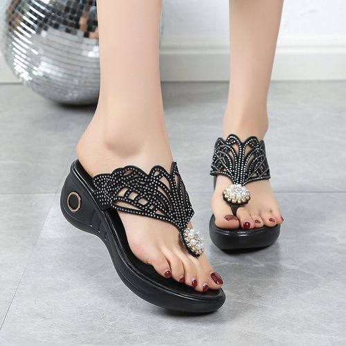 🔥2025 HOT SALE -50%🔥Summer new European and American pearl rhinestone sandals comfortable toe clip seaside vacation wedge heel large size slippers