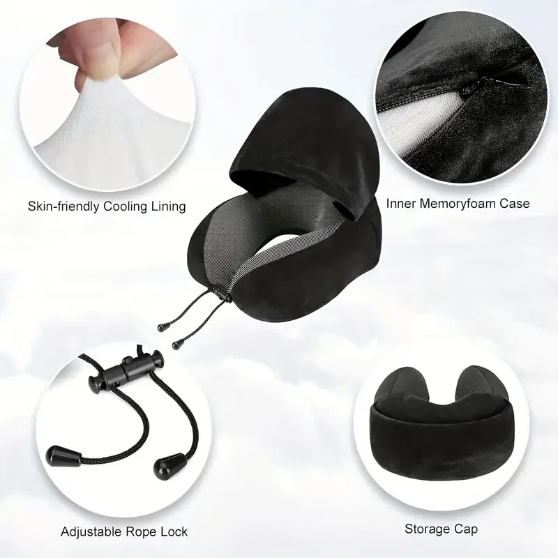 🔥For Your self🔥1pc Velvet Memory Foam Travel Pillow with Hood - Ergonomic Neck Support, Soft Breathable Fabric, Compact Carry Bag - Perfect for Long Flights, Road Trips, Office Naps, and Car Rides