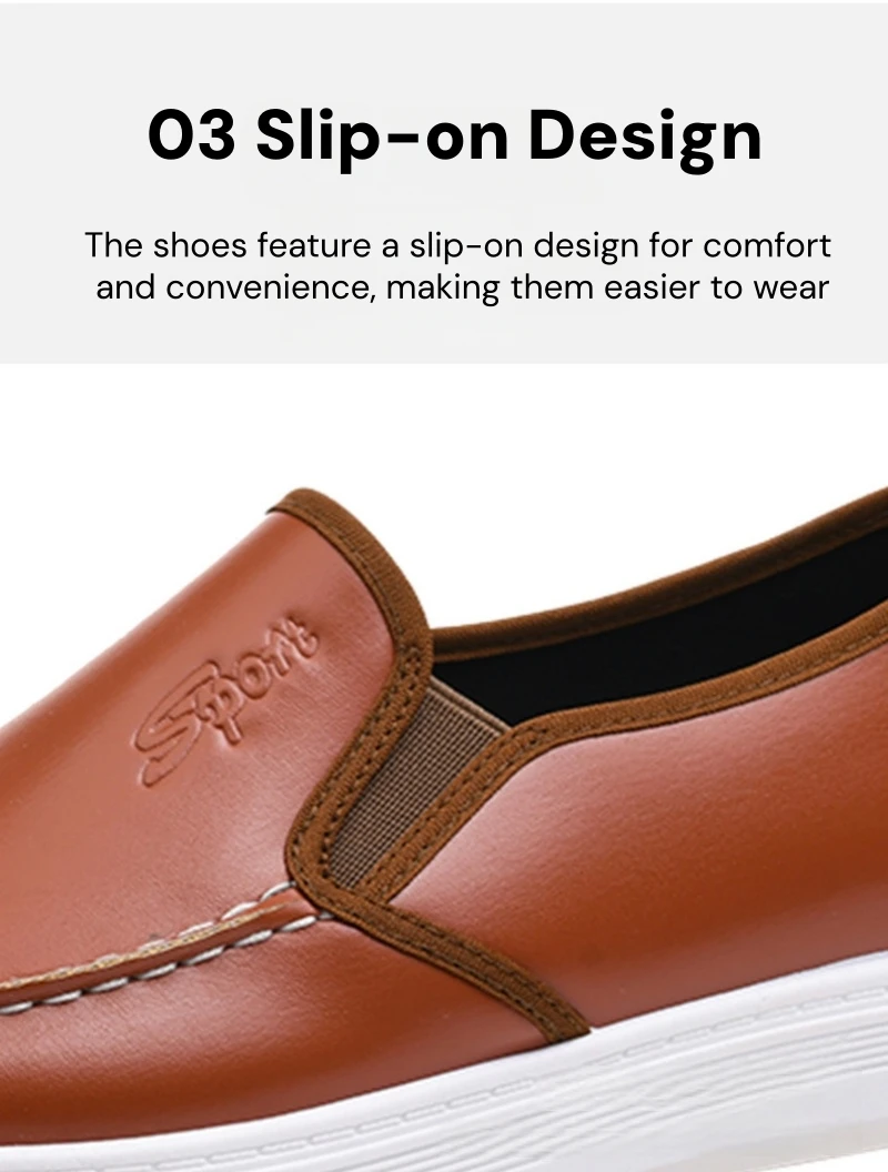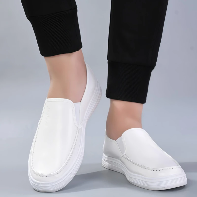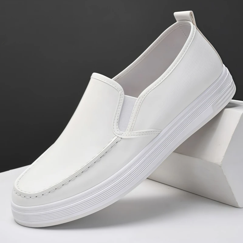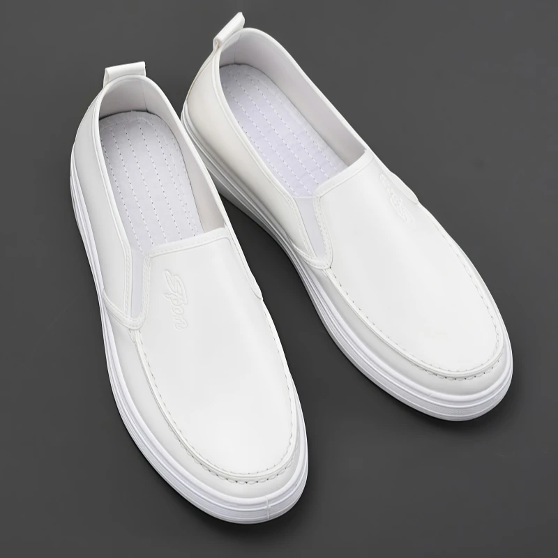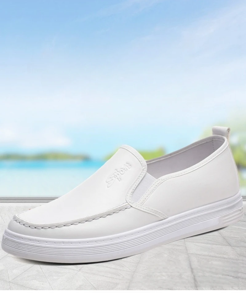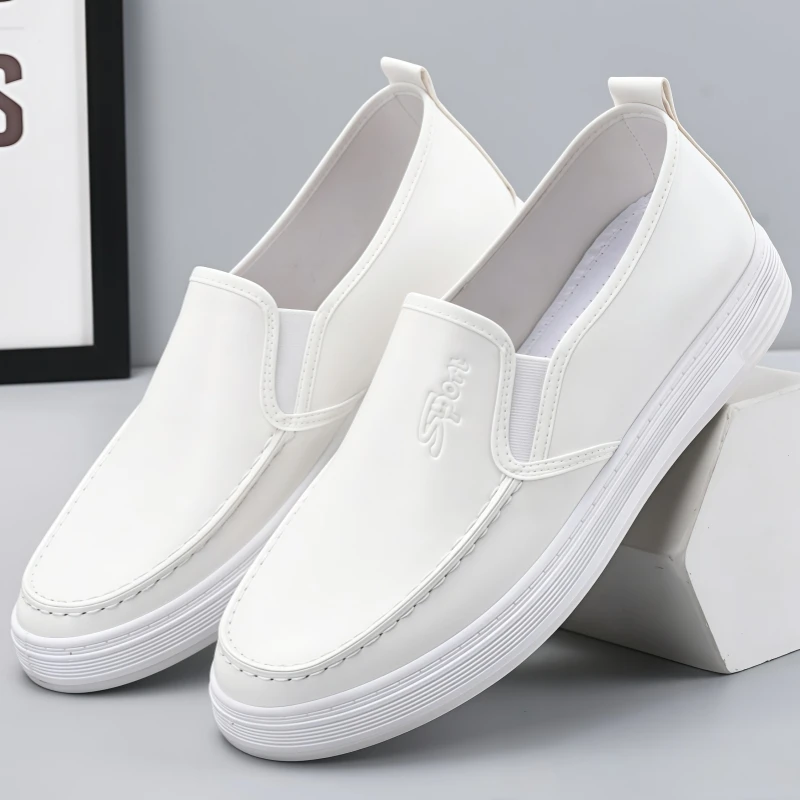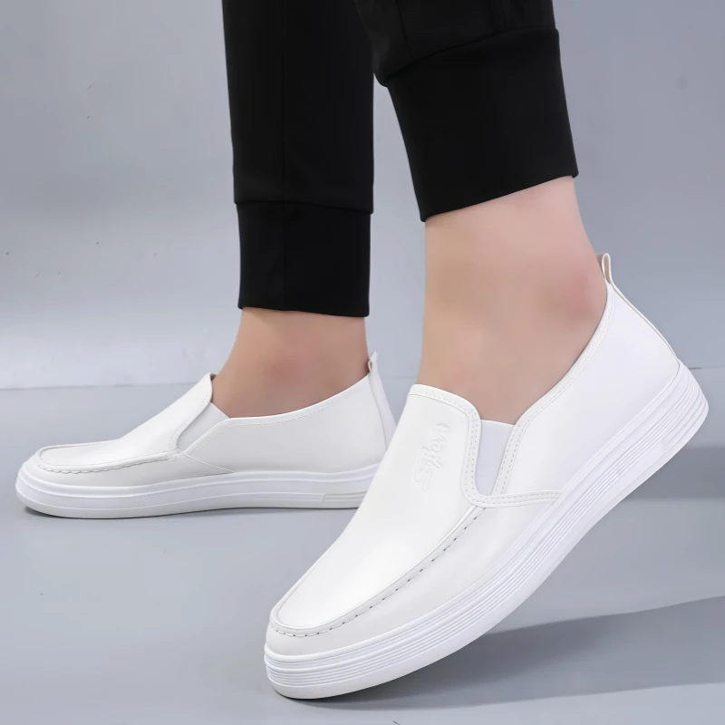 Men's casual leather shoes, waterproof, non-slip, soft-soled, work shoes, Korean style, versatile, flat, white leather shoes, slip-on sneakers