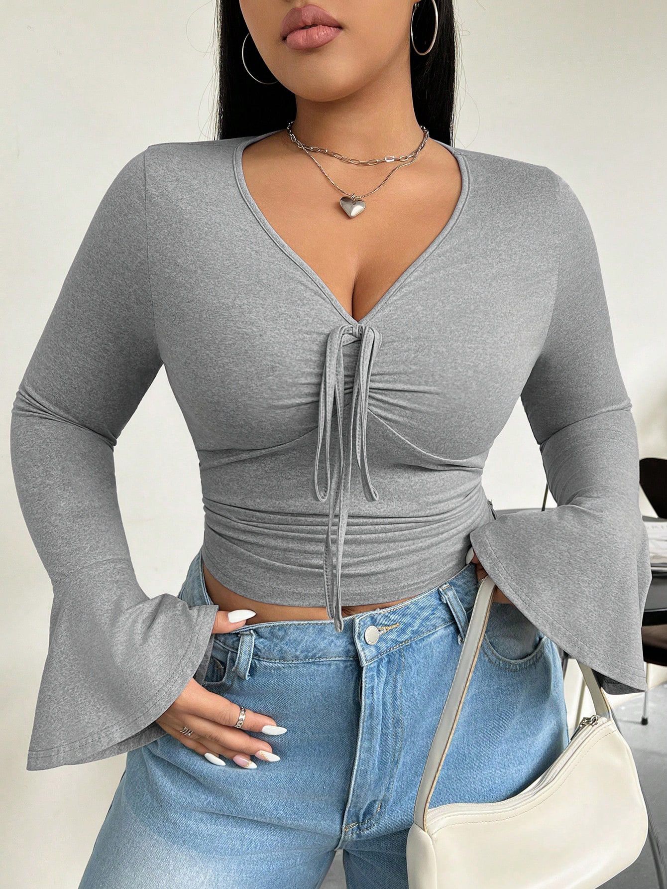 🔥2025 HOT SALE -50%🔥European and American large size V-neck long-sleeved T-shirt pure temperament slim short top