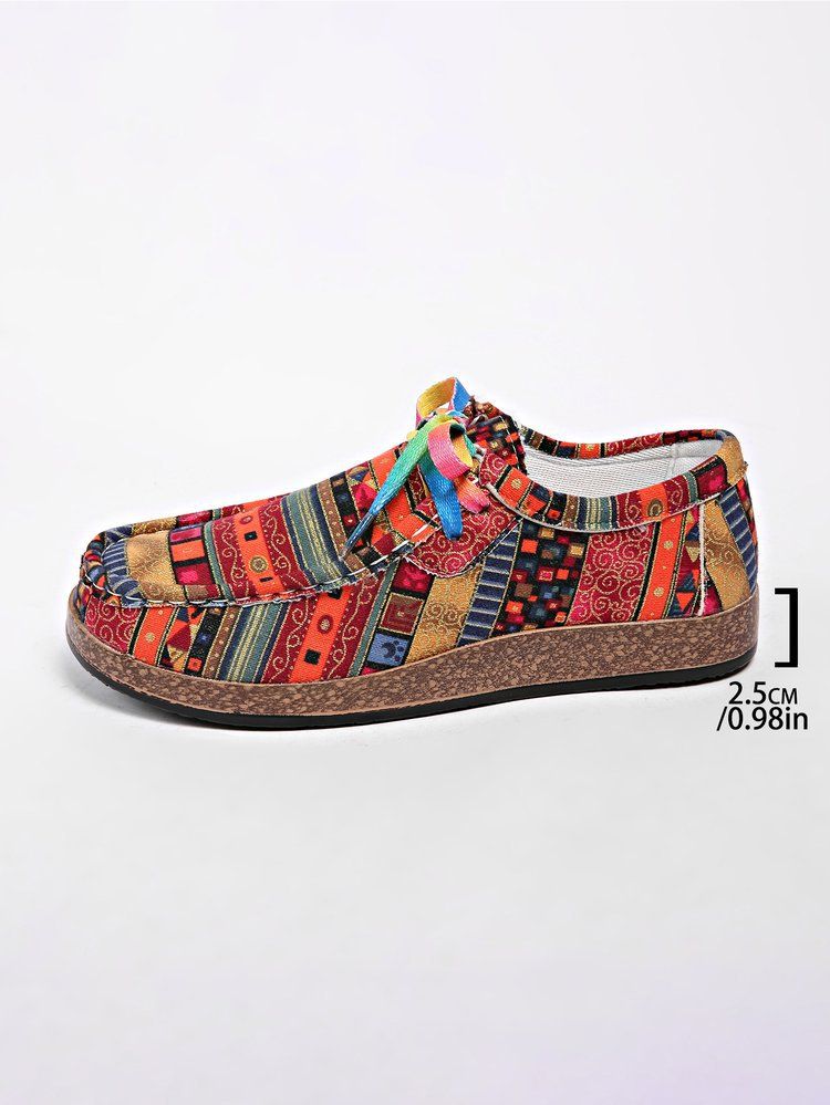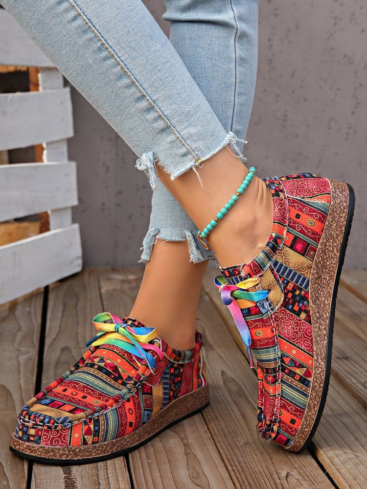 🔥2025 HOT SALE -50%🔥Large size ethnic style casual shoes for women colorful lace-up graffiti low-top canvas shoes wood grain thick-soled shoes