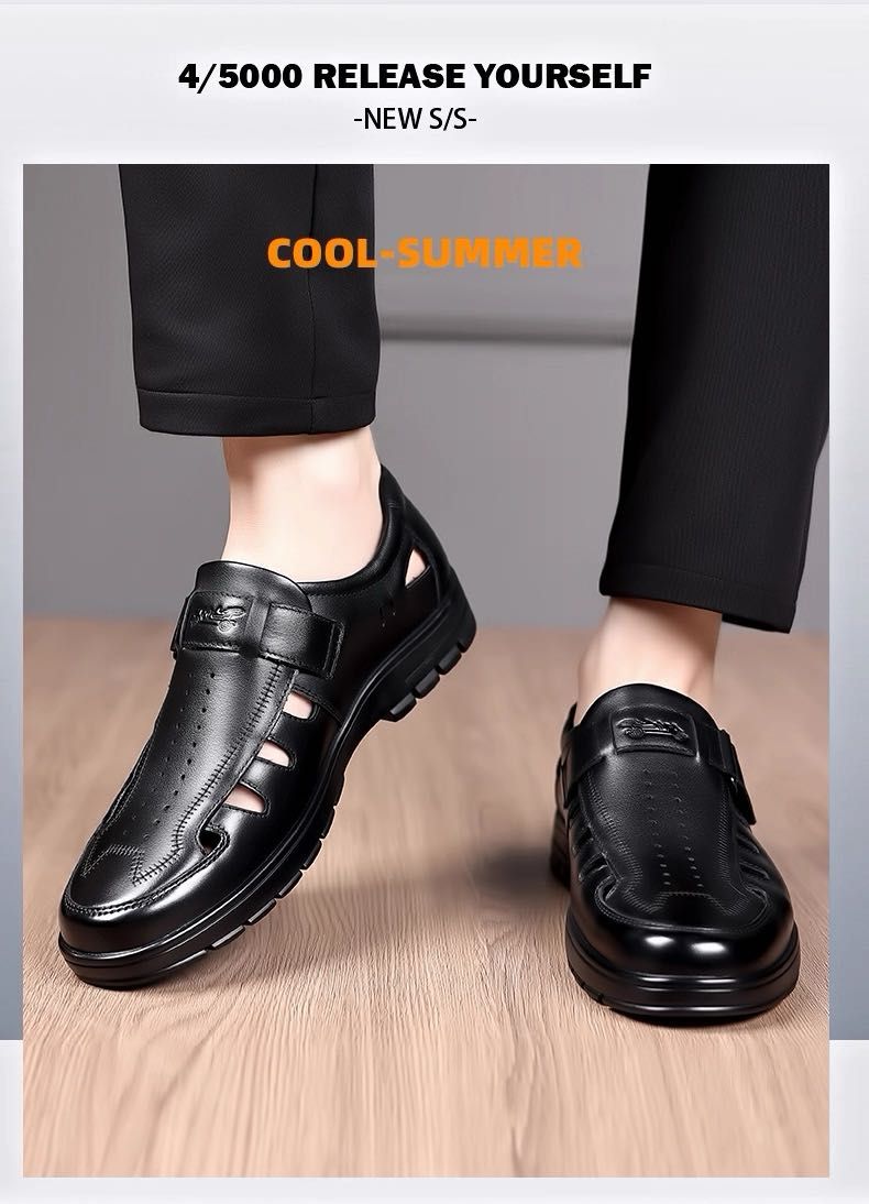 Men’s Black Leather Breathable Sandals – Anti-Slip Business Casual