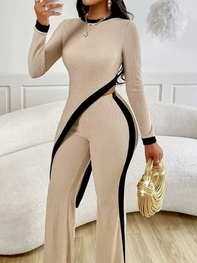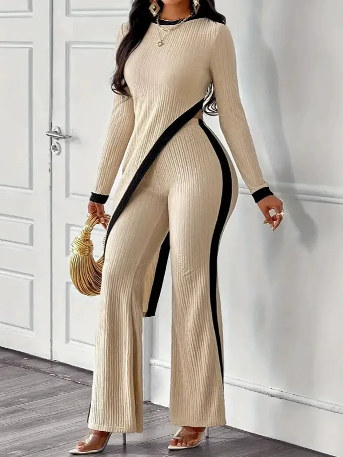 🔥2025 HOT SALE -50%🔥New women's fashion long-sleeved contrast color side slit T-shirt + splicing trousers suit